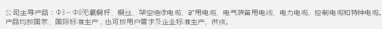 公司目前產(chǎn)品有:Φ3~Φ8無氧銅桿、銅絲、1-35kV裸電線、電氣裝備用電線、電力電纜、控制電纜和特種電纜。產(chǎn)品均按國家、國際標(biāo)準(zhǔn)生產(chǎn),也可按用戶需求及企業(yè)標(biāo)準(zhǔn)生產(chǎn)、供貨。
